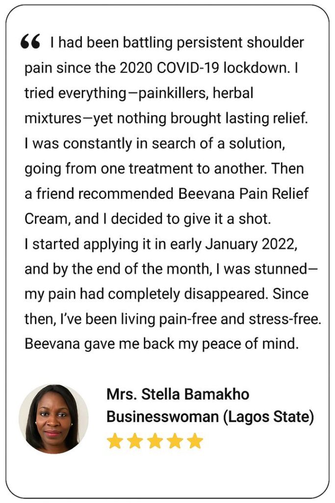 Standing for hours in my stall at the market used to leave me with burning leg pain. Painkillers gave temporary relief, but I needed something natural and effective. A customer told me about Beevana, and that day changed my life. I rub it in every night and wake up ready to hustle. God bless whoever made this cream.” – Aunty Bisi, Trader (Ibadan)